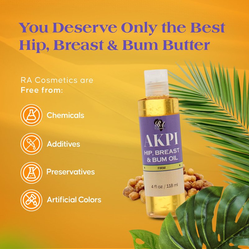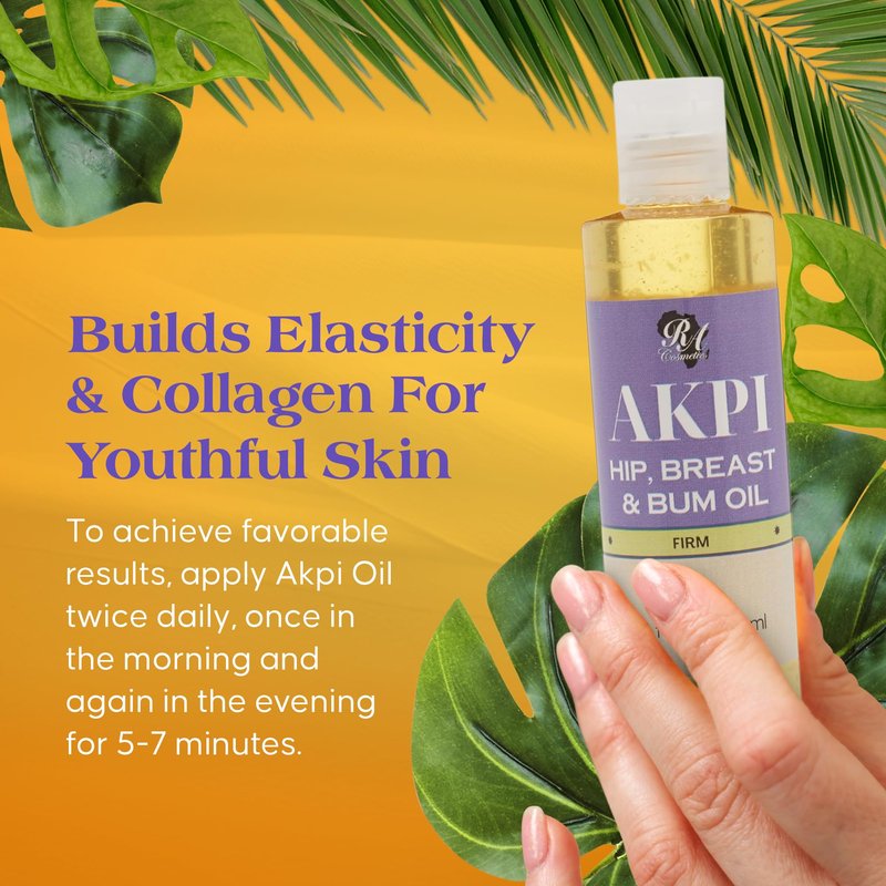 - Divine Curves Unleashed: RA Cosmetics Akpi Lifting Hip, Breast, and Bum Oil features the powerful natural seed oil, Akpi, known for its firming properties. This unique formula is designed to naturally lift, shape, and tighten your body and improve skin elasticity without the need for surgery.