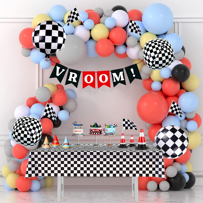 - Racing Birthday Party Decorations: Racing balloon garland with black white checkered party banner, tablecloth and flags, would be a great idea for race car theme birthday party. They will bring you a fun and memorable birthday celebration.