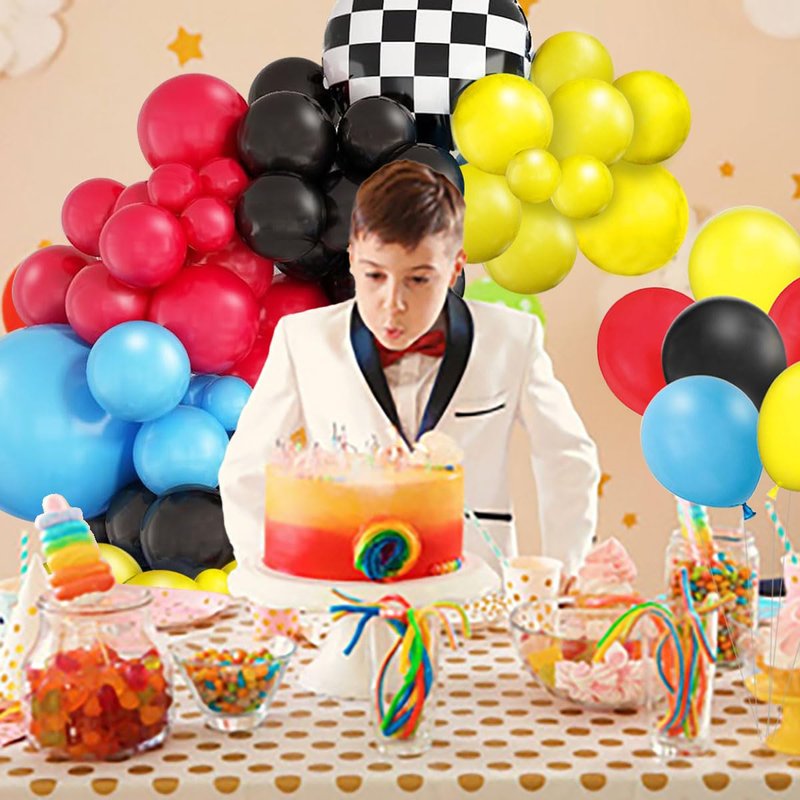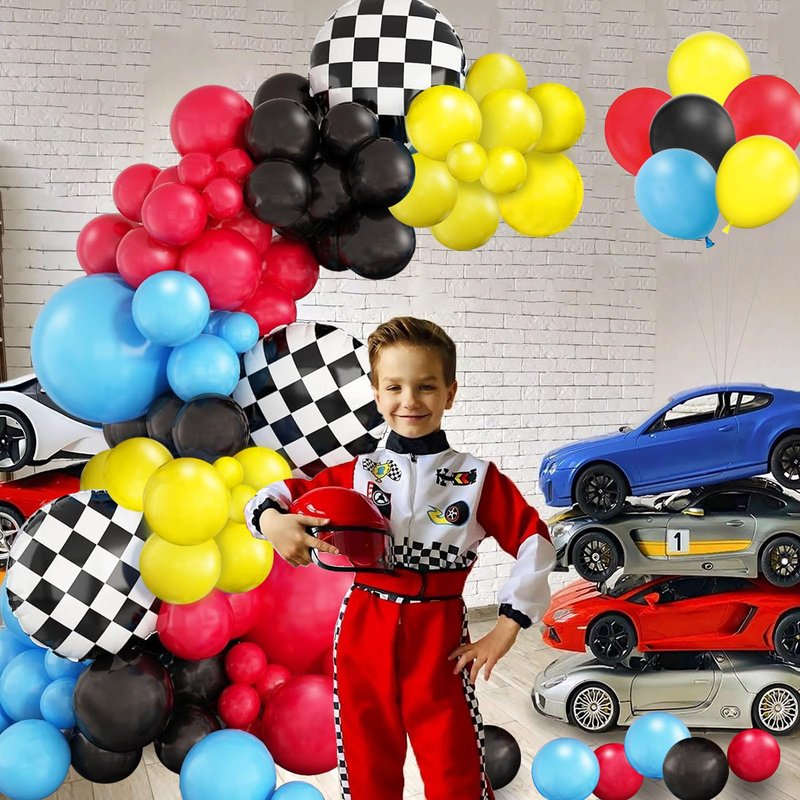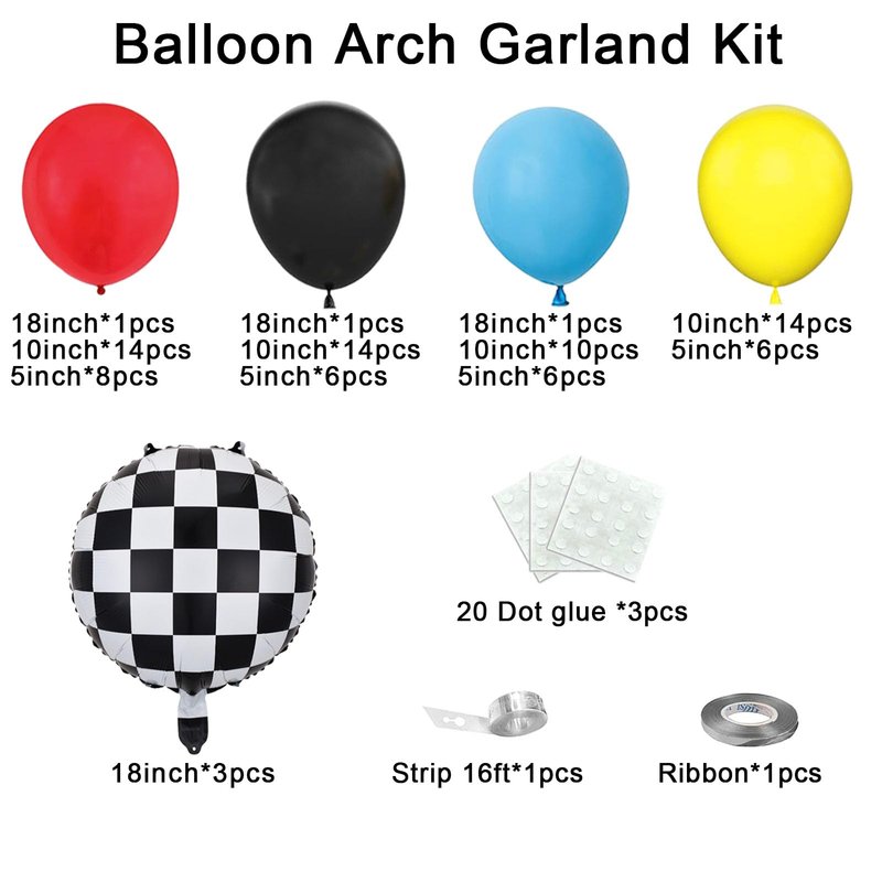 - Race Car Balloons Kit Include:5pcs 18 inch black and whitecheckered aluminum foil balloons,3pcs18inch Balloons red 1pcs,blue1pcs,black1pcs , 52 pcs10inch Balloons red14pcs,blue10pcs,black14pcs,Ye llow14pcs, 26 pcs 5inch Balloons red 8pcs,blue 6pcs,black 6pcs,Yellow 6pcs,1pc balloons strip , 3pcs adhesive tape,1pc ribbon.