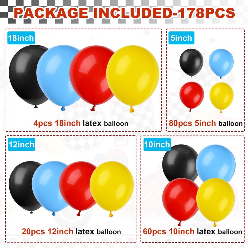 - 179 Pcs Race Car Balloons set included:1 pcs 29 Inch wheels foil Mylar balloons,2 pcs 18 Inch black and white chequered round foil Mylar balloons,2 pcs 18 Inch wheels foil round Mylar foil Mylar balloons,4 pcs 18 Inch (red,yellow,black,blue) Latex Balloon,20 pcs 12 Inch (red,yellow,black,blue)Latex Balloon,60 pcs 10 Inch (red,yellow,black,blue)Latex Balloon,80 pcs 5 Inch (red,yellow,black,blue)Latex Balloon,5 pcs 18 Inch black and white Checkered Flag,1roll balloon arch strip,1roll balloon glue dot (100pcs glue dots),1pcs ribbon,1 pcs straw,1pcs balloon tying tool.