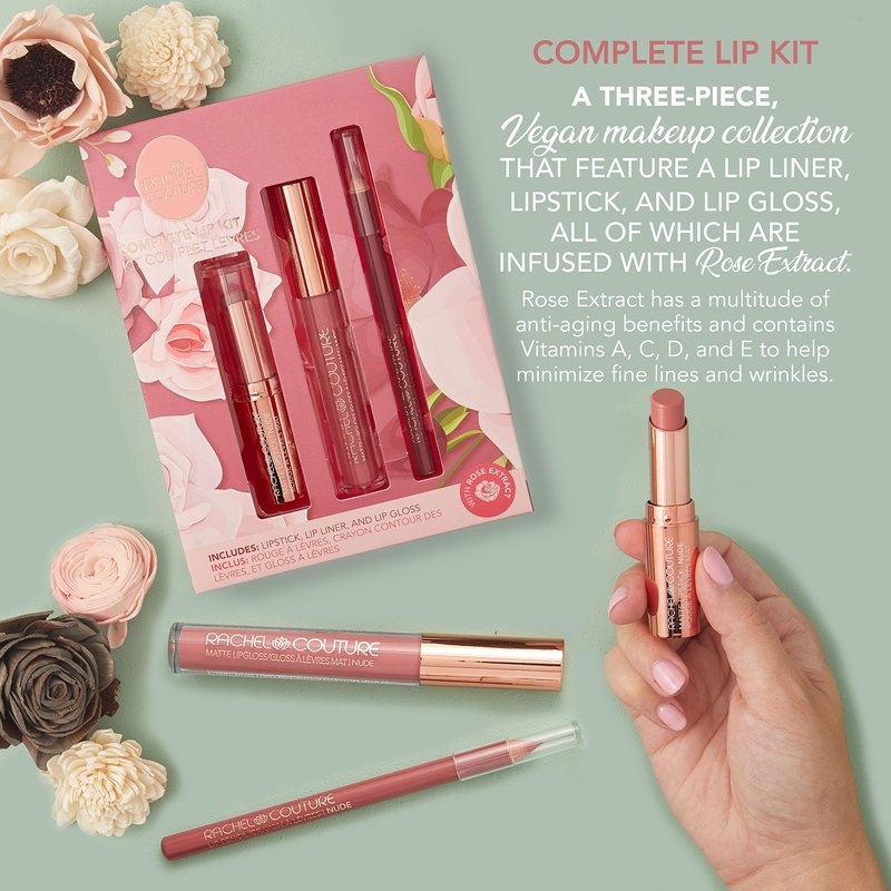 - COMPLETE LIP KIT - A vegan, three-piece makeup collection featuring a Lipstick, Lip Liner, and Lip Gloss all infused with rose extract