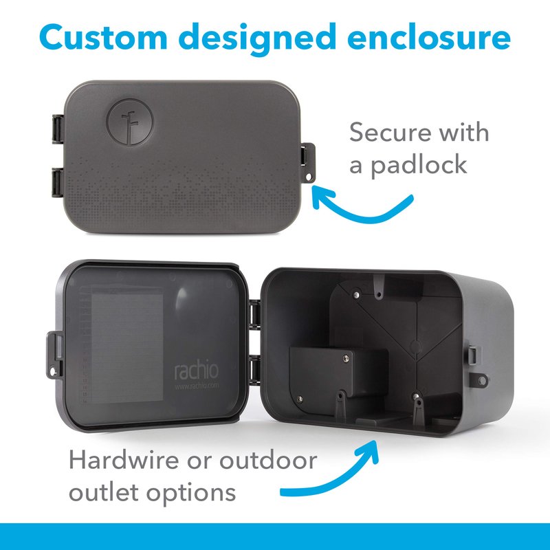 - Weatherproofed For Outdoor Use - Rachio’s enclosure is fully weatherproofed for outdoor use and the box is equipped with a security tab for a padlock. The sprinkler box features both hardwiring and outdoor outlet options.