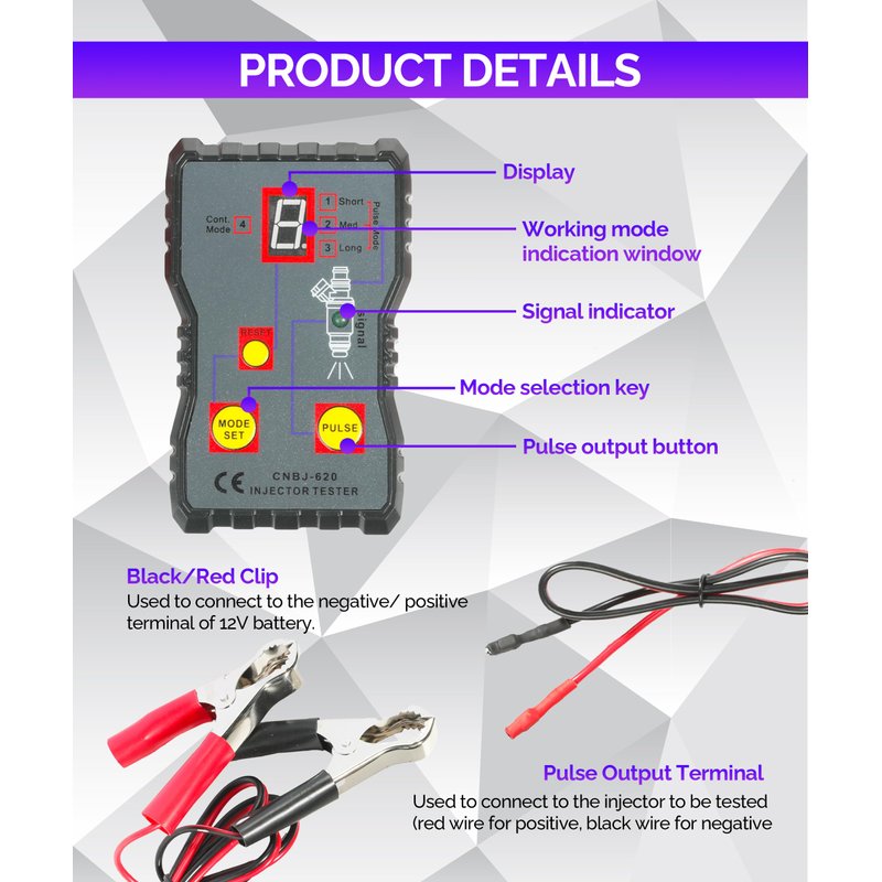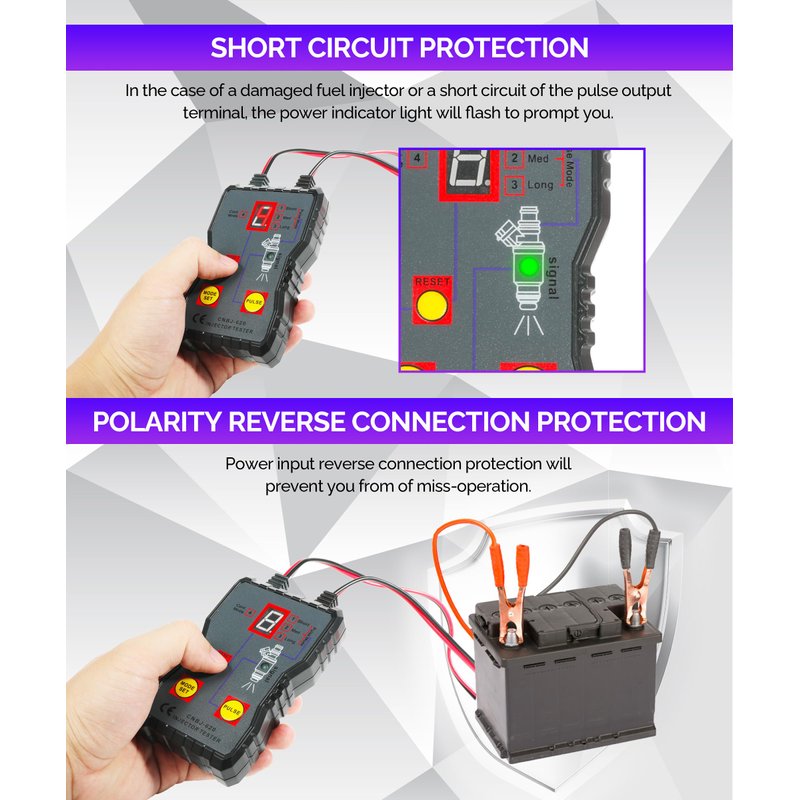 - [Short Circuit Protection] The fuel injector tester is powered by a 12V battery or an external 12V DC (recommended at least 1.5A) power adapter. The tester has power input reverse connection protection and output short circuit protection functions. If the fuel injector is damaged or the pulse output terminal is short circuited, the power indicator light will flash.