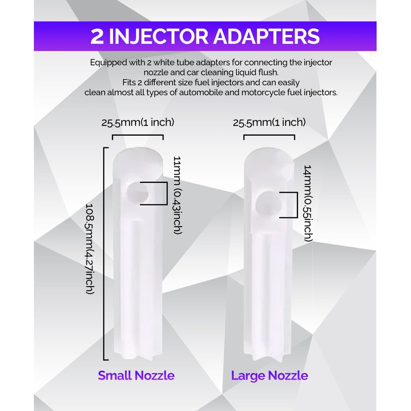 - [4 Adapters] The fuel injector tester cleaner is equipped with 4 white pipe adapters for connecting the fuel injector nozzle and car cleaning fluid flushing. These 4 fuel injector cleaning adapters are suitable for 2 different sizes of fuel injectors and can easily clean almost all types of automotive and motorcycle fuel injectors (except for cylinder direct injection nozzles).