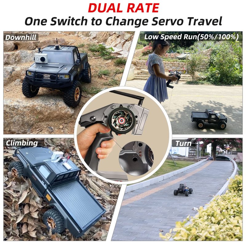 - DUAL-RATE SWITCH BY A BUTTON- Dual rate function support one switch to change different servo travel, like channel 2 throttle servo travel can be switched to 50% or 100% by SWD or SWA button