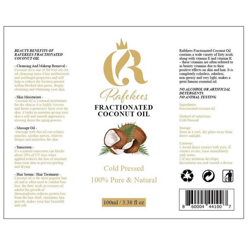 Rafekees Fractionated Coconut Oil is Cold Pressed, 100% Pure and Natural, Light Texture, Easily Absorbed, Used As Carrier Oil for Essential Oil, As Cleanser and Makeup Remover And Massage Oil