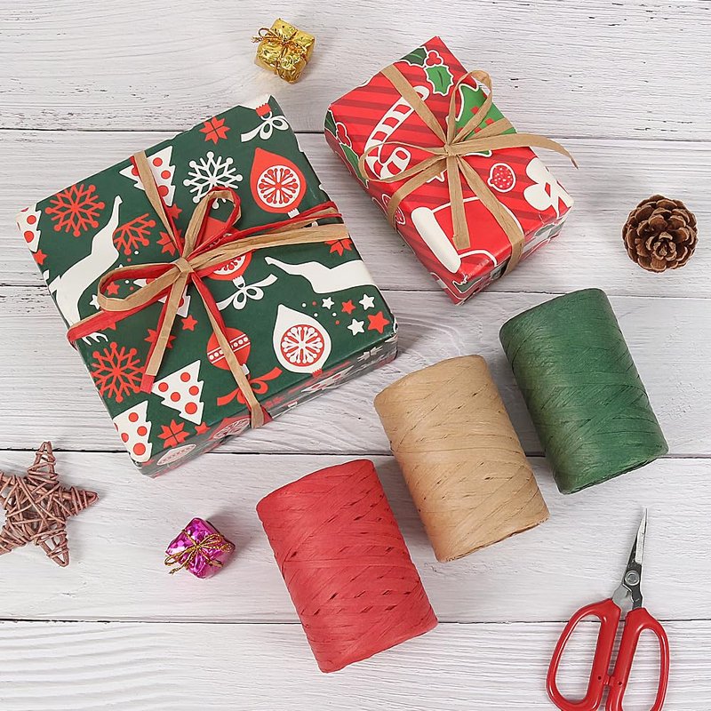 - CHRISTMAS COLORS - Our raffia ribbon set comes in festive red, green, and kraft colors, adding a bright and beautiful touch to your packaging. You can choose one color or use them together for an impressive and attractive Christmas wrapping experience