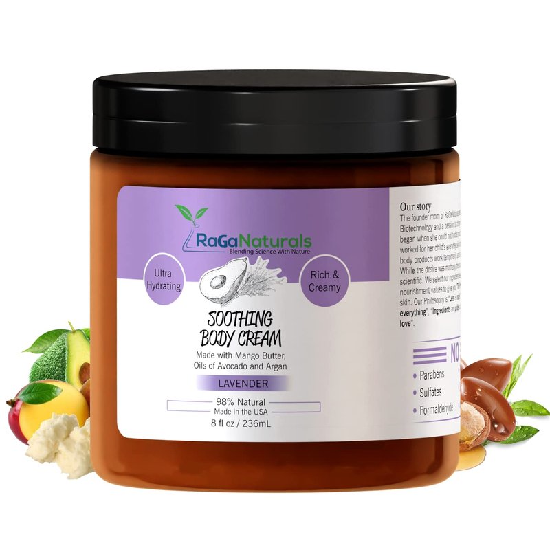 RaGaNaturals Calming Lavender Hand and Body Cream ā Nourishing Mango Butter with Argan & Avocado Oil - All Natural, French Lavender Essential Oil, Vegan - Dry, Sensitive, Itchy Skin & Eczema - 8 Fl Oz