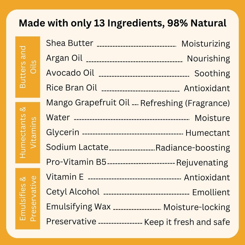 - 💡 No Surprises, Ingredients (in order of usage): Water, Shea Butter, Emulsifying Wax NF, Argan Oil, Avocado Oil, Rice Bran Oil, Glycerine, Sodium Lactate, Pro-vitamin B5, Preservative (Phenoxyethanol and Caprylyl Glycol), Cetyl Alcohol, Vitamin E (Tocopherol), Mango-Grapefruit Natural oil