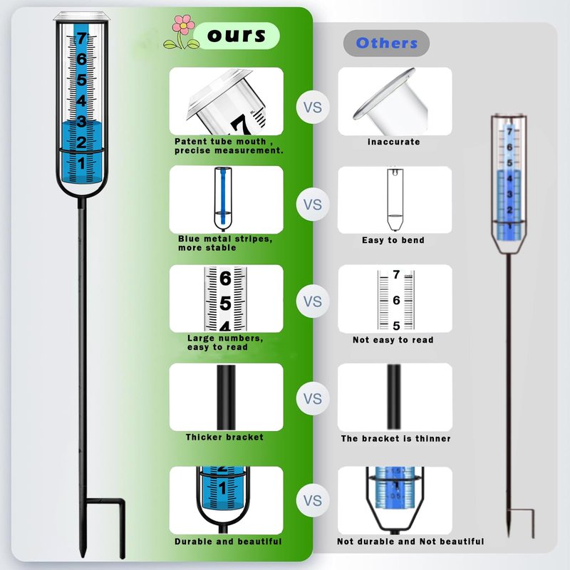 - 【Upgraded accurate rain gauge】We found that most rain gauges on the market do not measure accurately due to incorrect design of the tube mouth which leads to excessive collection of rainwater. We have improved the design of the tube mouth and make the area of rainwater collection at the tube mouth the same as the tube body(patented design), so that no excess rainwater enters the rain gauge tube, and the rainfall measurement value is accurate.