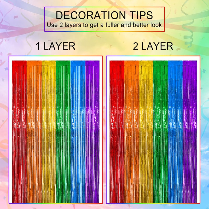 - 🎊 Versatile Decor Options: These rainbow foil fringe curtains are not limited to party decorations alone. They are perfect for live streamer backdrops, broadcast streamer backdrops, dessert table backdrops, stage backdrops, disco backdrops, bar backdrops, office decorations, home decor, pride party decorations, and more. Let your creativity shine and transform any space into a colorful celebration.