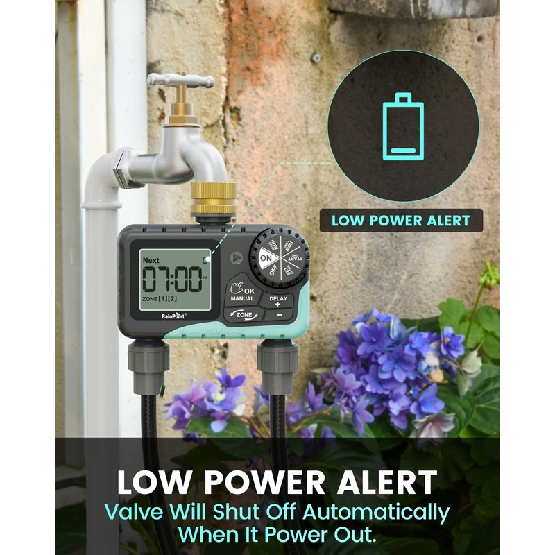 - 5% LOW BATTERY ALERT-- When the battery level is lower than 5%, a low-battery alert will show on the display, and the valve will automatically shut off to avoid water leakage.