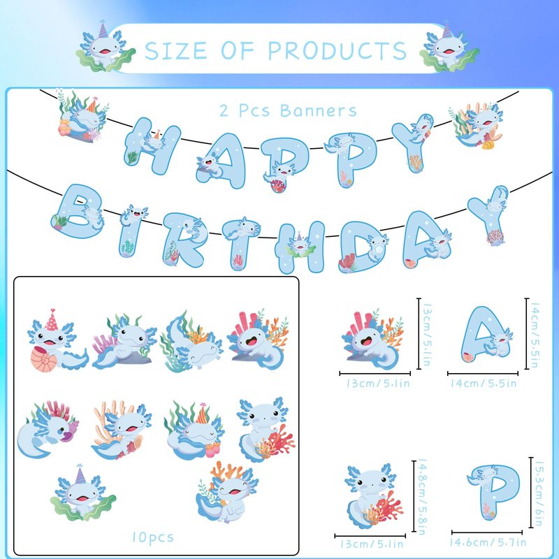 - What You Will Receive:The birthday party decorations are themed with cute axolotls, including 2 birthday banners and 10 hanging swirls Each decoration incorporates the cartoon image of the axolotl, adding a touch of fun and vitality to the birthday party