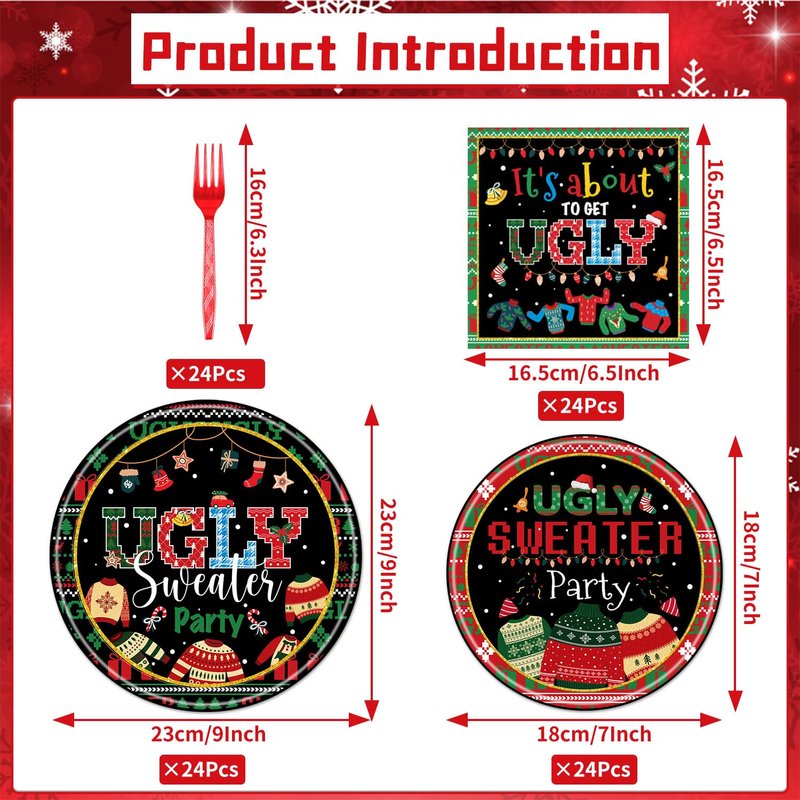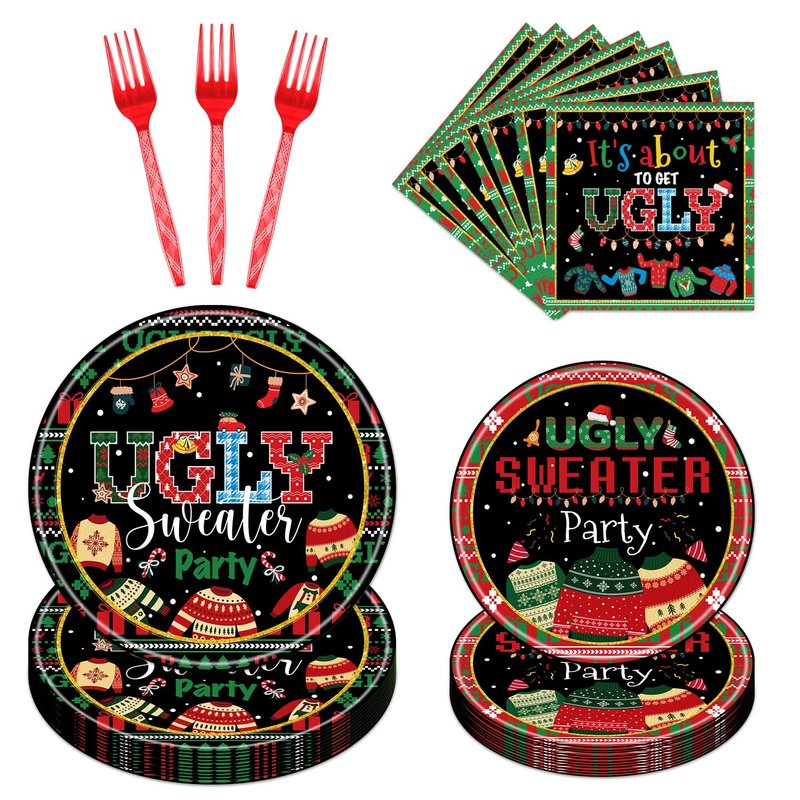 - Ugly Sweater Plates: You will receive the ugly sweater themed Christmas party plate set, including 24 large dinner plates, 24 small dinner plates, 24 it's about to get ugly napkins and 24 forks, totaling 96 pieces. Ugly sweater Christmas party plate set serves 24 people and will give your party space a fun, festive look and create a unique atmosphere.