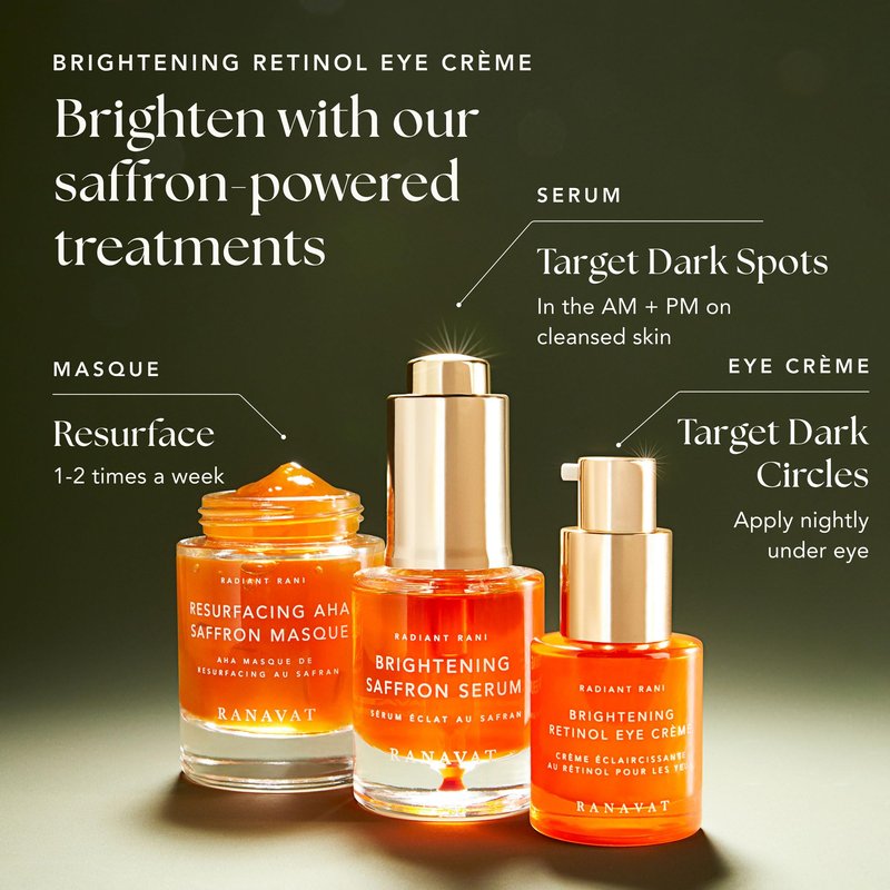 Indulge in the transformative power of this brightening eye cream with retinol, made with a 3-1 formula that reveals brighter, more youthful-looking under-eyes. Designed to be used during your PM routine, our night eye cream targets the look of dark circles, fine lines and eye puffiness to create a more rested appearance. Enriched with expertly selected Ayurvedic ingredients such as Bakuchi Seed and Saffron, these powerhouse ingredients work synergistically to smooth, soften and revitalize. Bakuchi is known for amplifying retinol's wrinkle-fighting power while reducing eye bags and giving you a refreshed and radiant complexion. Saffron has many opulent properties, helping to protect your skin from free radicals, which can cause premature aging. The Saffron in this under eye brightening cream aids in improving skin tone and brightening your under eye dark circles. Our eye wrinkle cream is formulated with micro-encapsulated retinol for enhanced stability and long-lasting clinical results. By using this form of non-irritating retinol, this night cream ensures the safety of your delicate eye area. Designed to be used at night, gently tap a thin layer of the eye retinol cream under your eyes, working outward and upward towards your brow. Let the product absorb before applying other products.