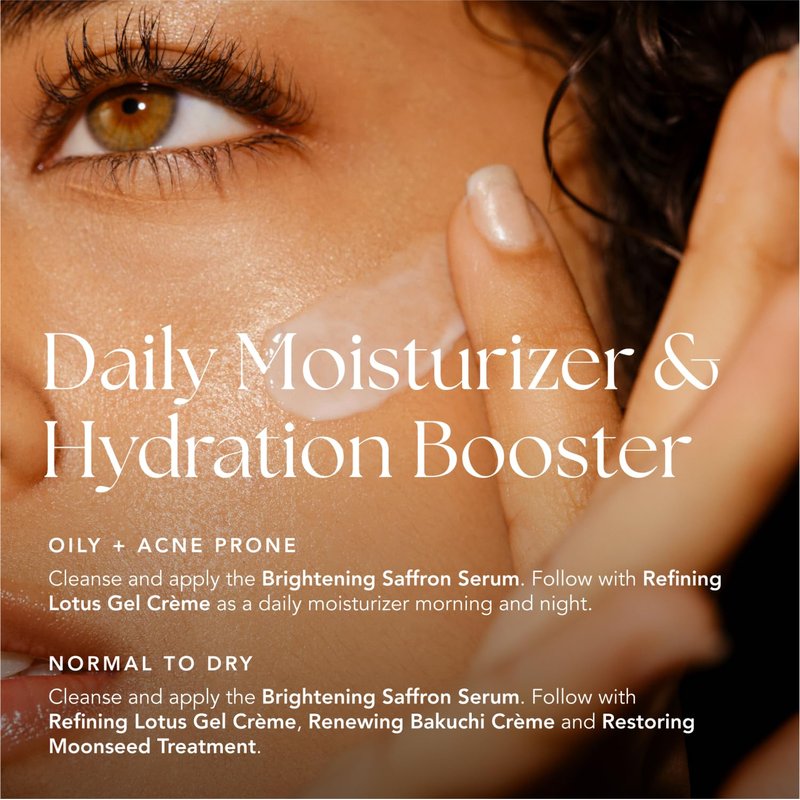 - How to Use - Apply a light, even layer to skin in the morning and night as your daily face moisturizer. For oily + acne prone skin, cleanse and apply the Brightening Saffron Serum; Follow with Refining Lotus Gel Crème as a daily moisturizer morning and night. For normal to dry skin, cleanse and apply the Brightening Saffron Serum; follow with Refining Lotus Gel Crème, Renewing Bakuchi Crème and/or Restoring Moonseed Treatment.