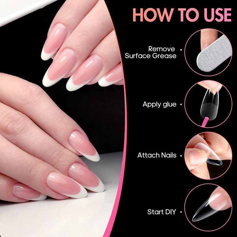 - Simple Operation:We just need to pick the clear nail tips to suit the length and size of each nail. After matching a suitable false nails,apply glue to the edge of the fake nail,press it on your nail for 10 seconds,and then shine a nail lamp on it for 1 minute. The full cover fake nails are easy to use,much more beginner-friendly than regular acrylic nails.