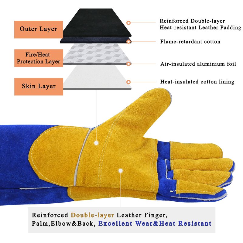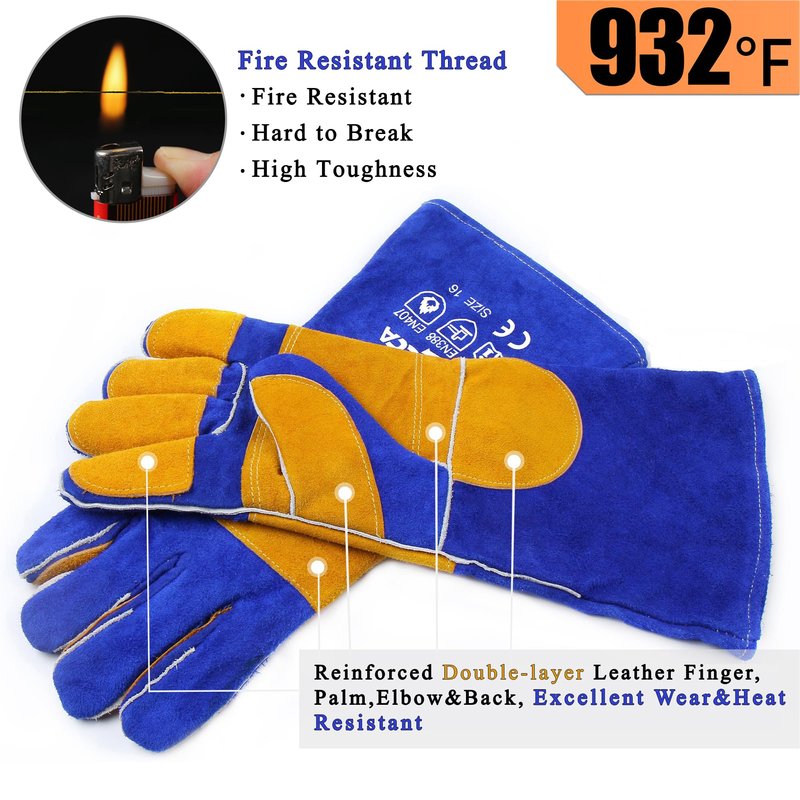 - SUPERIOR SECURITY FOR FORERAMS:Our 16-inch extra-long gloves with 7.5-inch sleeves provide superior forearm protection, effective against welding sparks, grinding debris, fire, open flames, hot coals, or burning wood in a fire pit or wood stove. These gloves ensure reliable protection even in the most challenging environments.