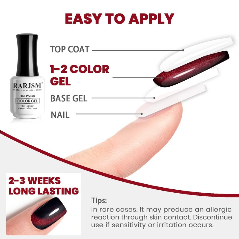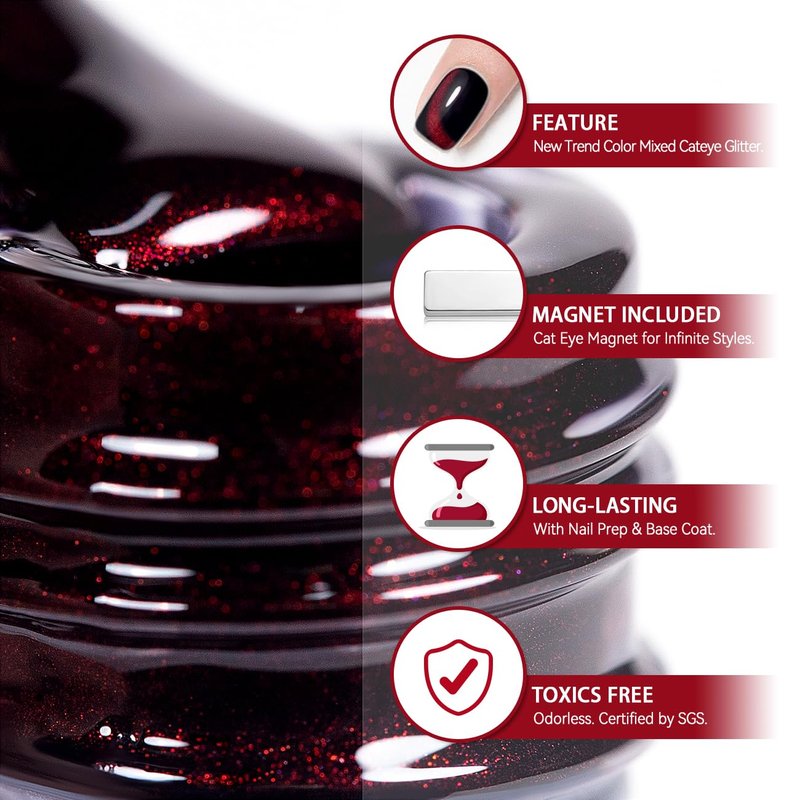 - BLACK RED CAT EYE EFFECT:Cat eye gel nail polish is a truly dreamy effect that reflects light in the same way a crushed velvet texture might. Made with fine magnetic shimmers and deep red pigments, our new shades create optical nail-lusions that move with every angle