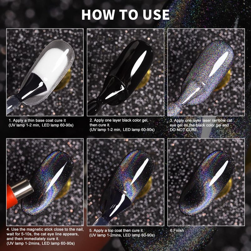 - HOW TO APPLY CAT EYE GEL: Requires UV/LED nail lamp and top coat, magnets stick- Apply two layers of cat eye gel and one layer of top coat, requires cure under LED/UV nail lamp for each layer. It needs skills in applying cats eye nail polish and practice makes perfect.(The product does not contain magnets stick)