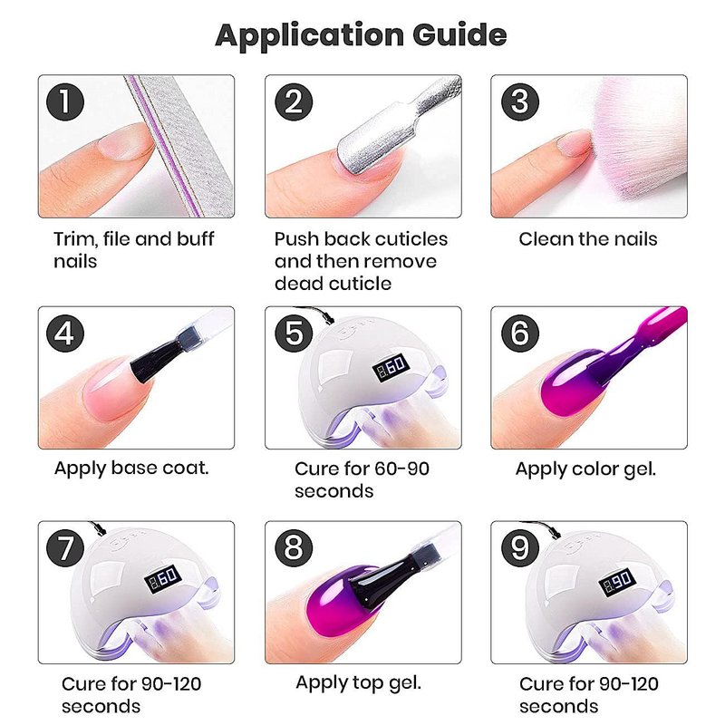 - BIG CAPACITY AND EASY TO APPLICATION:Big capacity not only allows for creating more nail art,but also giving as a gift for friends who enjoy manicure nail art.The temperature changing gel nail polish need base coat and top coat,and cured under UV for about 60-90 seconds.With these three conditions, you can start your manicure journey at anytime or anywhere.