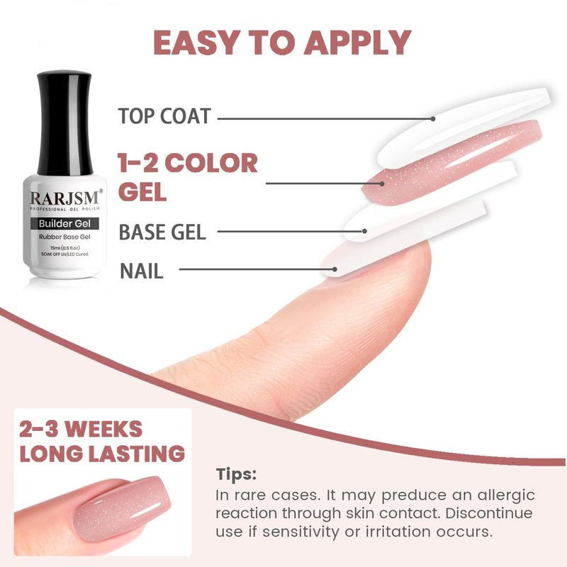 - NUDE GLITTER RUBBER BASE:RARJSM rainbow glitter rubber base gel nail polish is a nude skin tone gel and it is tend to be thicker than a regular base coat.The nude-toned color is littered with iridescent glitter that reflect and twinkle no matter where the light catches the nail.Rubber base gel can be used as base coat,quick extension gel,sheer apricot pink color gel and nail strengther gel