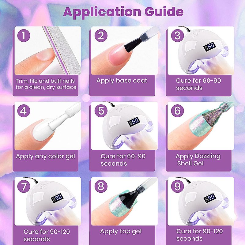 - ★EASY APPLICATION & LONG LASTING: The dazzling shell series gel nail polish is long lasting for 21+ days with perfect shine under proper application - With base gel top coat under the full application Process. Highly recommend a minimum of 60 seconds with a LED light and 2 minutes with a UV lamp for each coat.