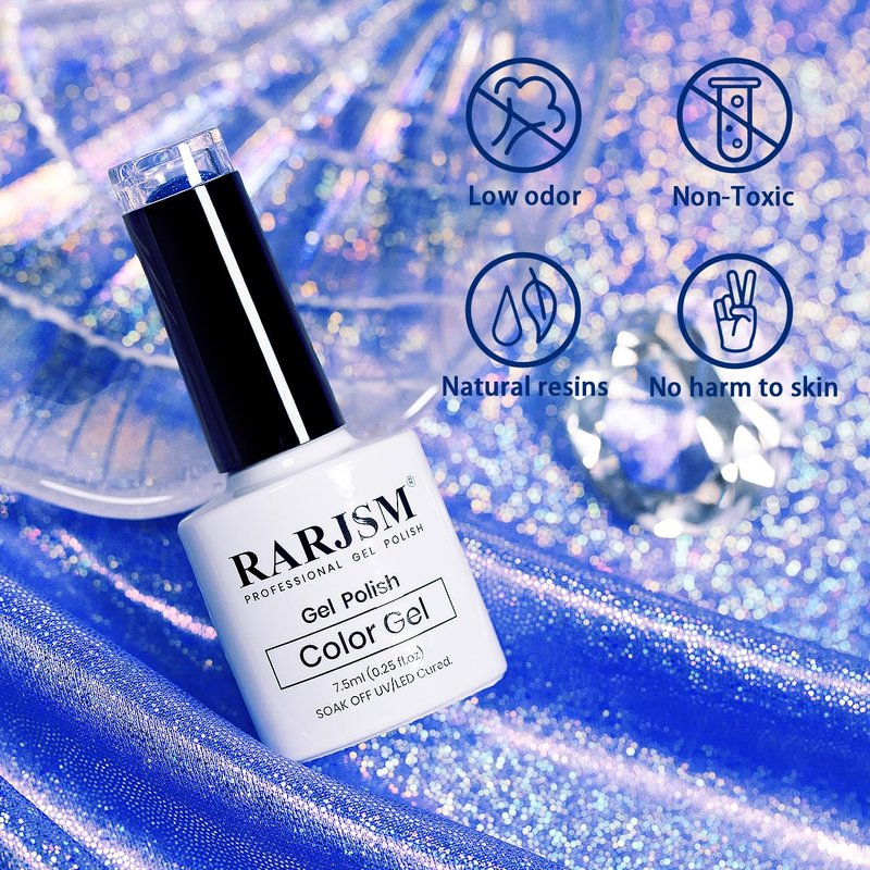 • NAIL LAMP REQUIRED:RARJSM flash reflective glitter gel polish need to cured under nail lamp.With proper application this low odor shimmer glitter gel polish can keep perfect more than 2 weeks.It’s a highly-pigmented, long-lasting polish that won’t chip or smudge.No harsh ingredients or adhesives with low smell, rich color, middle consistency, self-evenly, no shrink and edge.