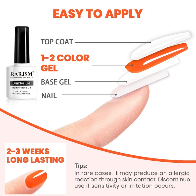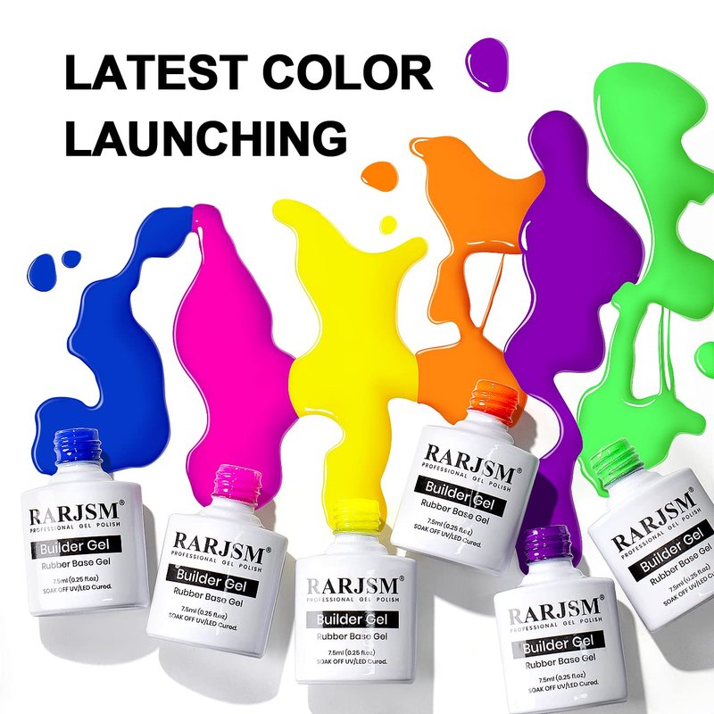 - 【MULTIFUNCTIONAL RUBBER BASE COAT】RARJSM rubber base gel nail polish is a neon bright color gel and it is tend to be thicker than a regular base coat.Rubber base gel can be used as base coat,quick extension gel,birght color gel and nail strengther gel. Rubber base gel also helps to make your nails more flexible if you have weak and brittle nails that might break or crack easily.