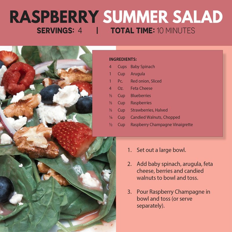 - 👩🍳 SUMMON YOUR INNER-CHEF. Some of the chef’s favorite recipes with our raspberry salad dressing include broccoli salad, a berry summer salad, and marinated pork. Allow yourself to get creative in the kitchen!