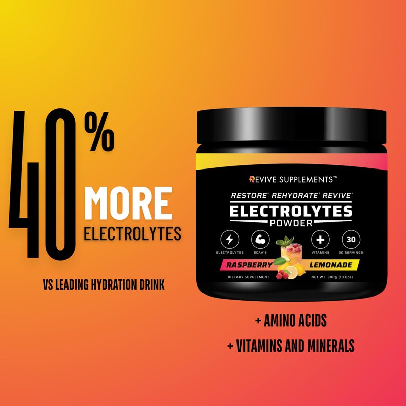 Introducing Revive Supplements Electrolyte Powder – the ultimate hydration solution designed to replenish and rejuvenate your body with a refreshing burst of Raspberry Lemonade flavor. Elevate your hydration game with our advanced electrolyte hydration mix, meticulously crafted to support optimal performance and recovery. Whether you're an athlete pushing your limits, following a keto diet, or simply looking to stay hydrated throughout the day, our electrolytes powder offers the perfect balance of essential nutrients. Packed with BCAAs, vitamins, and trace minerals, Revive Supplements Electrolyte Powder delivers an unparalleled blend that not only quenches your thirst but also fuels your body with the goodness it needs. Our unique formulation ensures you receive all the vital electrolytes necessary for muscle function and energy production without any added sugars or artificial ingredients. The inclusion of branched-chain amino acids (BCAAs) supports muscle recovery post-workout, making it an ideal choice for fitness enthusiasts aiming for peak physical performance. Each serving of Revive Supplements Electrolyte Powder guarantees ease of use and maximum absorption. Simply stir this premium electrolyte powder into water to create a delicious drink mix that transforms plain H2O into a powerhouse hydration drink. With 30 servings per container, you will have an ample supply to keep dehydration at bay, whether you're tackling intense workouts or navigating through daily activities. Trust in Revive Supplements to provide superior hydration—with ultimate convenience and delectable taste—in every scoop.