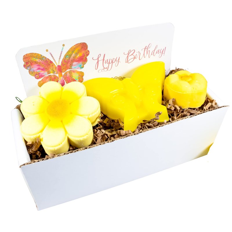 This unique birthday spa gift box features a butterfly glycerin soap, a handpainted flower bath bomb, and a solid bubble bath bar. Scented with a mouth-watering combination of ice-cold lemonade, sweet, juicy raspberries, with a unique twist of natural lavender and white musk.