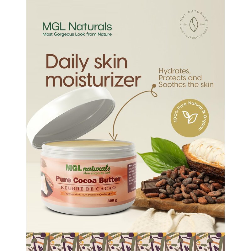 MGL Naturals Pure Cocoa Butter is an all-natural whipped body butter that has emollient, and skin moisturizing properties, it easily absorbs into the skin to hydrate and soothe the skin. It helps restore elasticity to the skin, stretch marks and tattoo care. Use as an all-body daily moisturizer to preserve and improve the natural skin leaving it smooth and glowing. Made with 100% natural raw cocoa butter and cocoa essential oil. Giving you the Most Gorgeous Look from nature. DIRECTION: Rub a small amount in the palms until melted, then apply a thin layer on skin, face, hands, and feet. Apply as often as needed. For external use only. INGREDIENTS: Cocoa Butter and cocoa essential oil. SIZE: 11 oz | 300grams