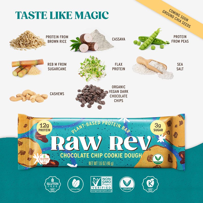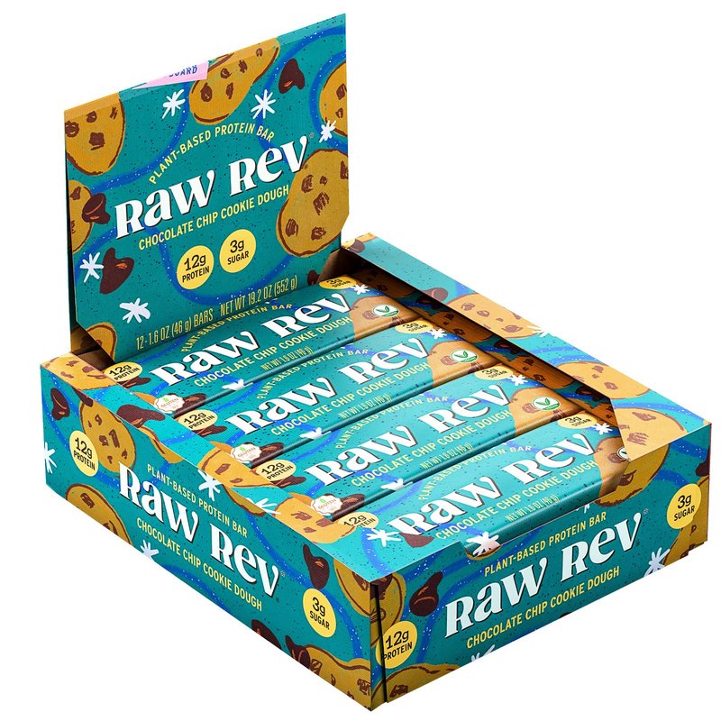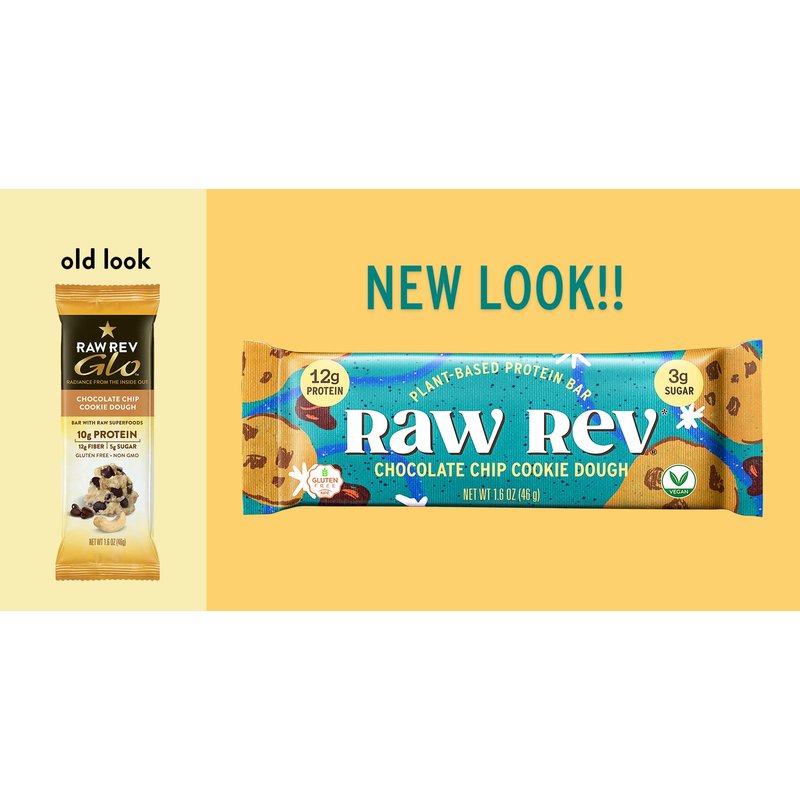 - Color: Raw Rev Glo Protein Bars, Chocolate Chip Cookie Dough, 1.6 Ounce Bar (Pack of 12) 10g Protein, 5g Sugar, 12g Fiber, Vegan, Plant-based Protein, Gluten-free Snack Bar