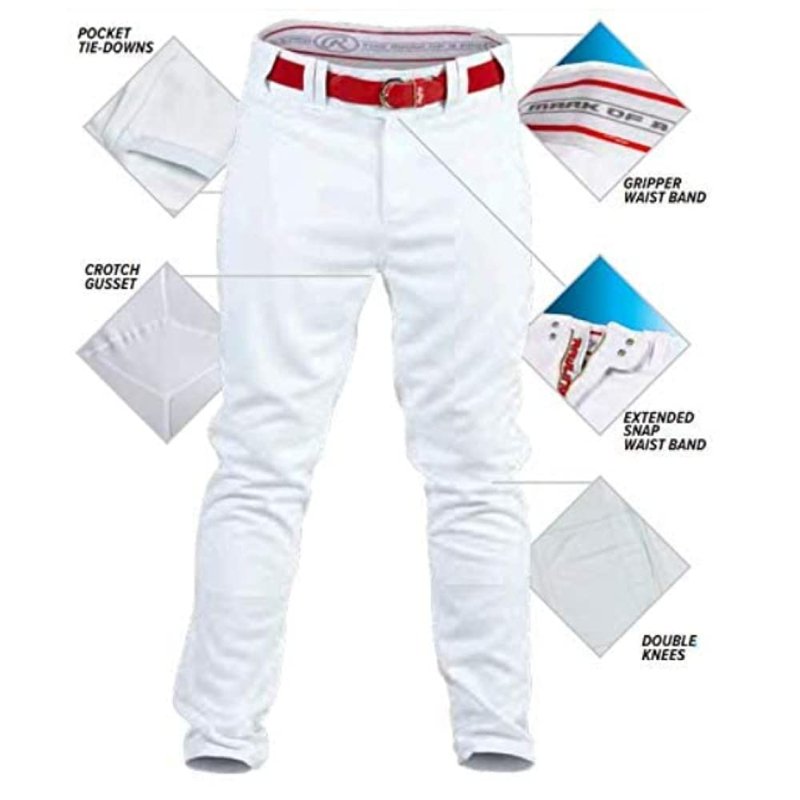 Rawlings YouthA PRO150 Semi Relaxed Piped Baseball PantsFeatures: * Pro-Dri technology making them excellent for a hot day * Stain resistant fabric for enhanced longevity * Wide elastic waistband with gel gripper strips provides a strong and secure hold * Semi-relaxed fit * 2-snap closure * Care: machine wash, tumble dry * Material: 100% polyester
