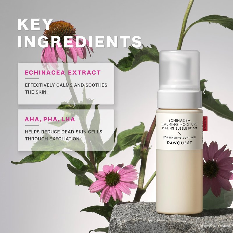 Achieve smooth, glowing skin with the RAWQUEST Echinacea Calming Moisture Peeling Bubble Foam. Infused with the soothing power of Echinacea and a blend of hydrating ingredients, this innovative peeling bubble foam gently exfoliates while providing essential moisture to your skin. Its unique formula transforms into a rich, bubbly foam upon contact, lifting away dead skin cells and impurities for a refreshed, radiant complexion. Ideal for sensitive skin, this gentle yet effective exfoliator calms irritation while improving skin texture and clarity.