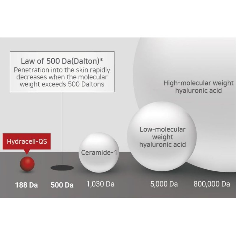 - π€ ONLY 188 Da - Patented Hydracell-QS : Our patented moisturizing agent, is a unique moisture supply system that strongly controls the dryness of the skin with an ultra-low molecular weight ingredient that penetrates the layers of skin and moisturizes the skin from the inside out. The 500 Dalton Rule states that molecules greater than 500 Daltons cannot penetrate the skin barrier. The size of ceramide is 1,030 Da and Hyaluronic acid is 5,000 Da, while the size of Hydracell-QS is only 188 Da.