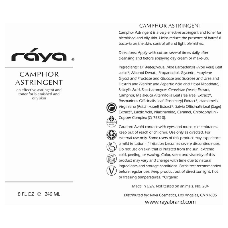 - Crafted with Excellence: Our RAYA Camphor Astringent is proudly made in the USA, adhering to the highest quality standards. Trust in a product that's meticulously crafted with care and backed by our unwavering commitment to excellence.