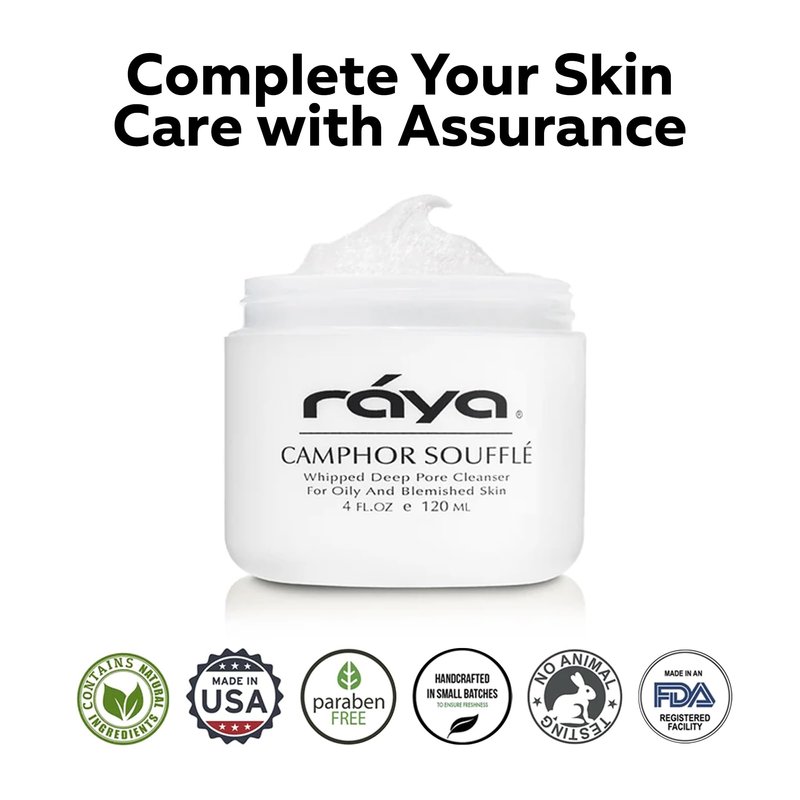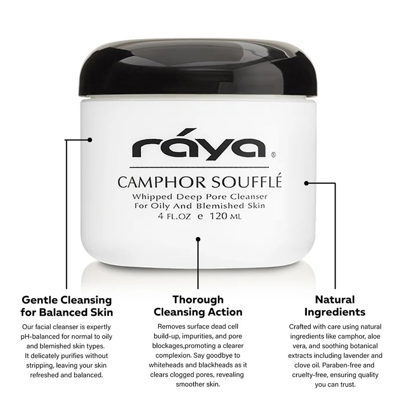 - UNIQUE, PURIFYING FORMULA: RAYA Camphor Soufflé Facial Cleanser is a luxurious, creamy face wash that deeply purifies, refreshing your skin without stripping it. Designed to target excess oil and blemishes, this cleanser is ideal for those with oily, combination, or acne-prone skin. Enjoy a cooling Menthol and soothing Aloe Vera Gel infusion that naturally cools and calms for a balanced, healthier-looking complexion.