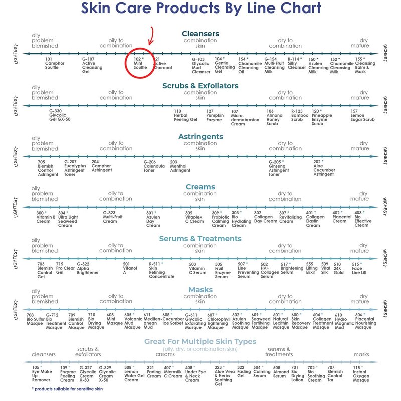 Mint Soufflé is a mild, pH-balanced, facial cleanser recommended for normal to oily and combination skin types. It is a deep pore cleanser with decongestive and anti-irritation activity, and it has a smooth, whipped, soufflé-like consistency, as well as a fresh minty scent. It removes surface dead cell build-up, impurities, and pore blockages and promotes a clear, smooth complexion. Mint Souffle can also be used as a luxurious, facial, shaving cream. Fucus, Thyme, Horsetail Extract, and Sage Extract help cleanse and rejuvenate normal to oily and combination skin. Mint Soufflé Facial Cleanser (102) | RAYA