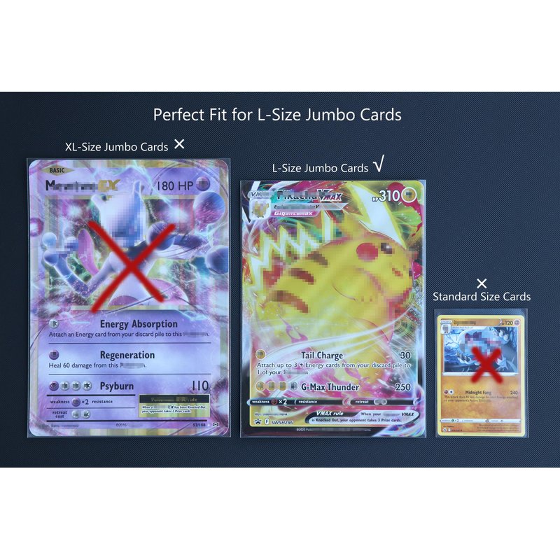 - Note: Please Measure your jumbo card size before purchase to determine the correct tier size, L size: 5.4"x7.4"(compatible with PTCG, Digimon, Cardfight Vanguard, Dragonball Super) , XL Size: 5.7" x7.9" (compatible with PTCG, NOT compatible with MTG sized jumbo cards). 1 year product warranty with 30 days return policy.