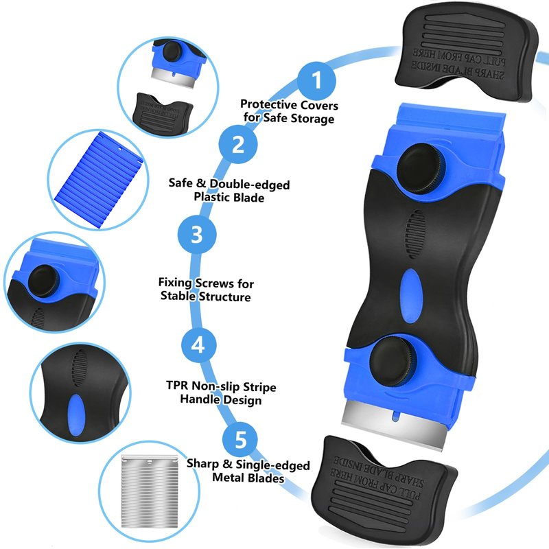 - Multifunctional Scraper Tool --- One is a heavy-duty long-handled scraper, which is perfect for working in hard-to-reach places. One is a cleaning scraper with contract hidden blades. One is a scraper tool with both metal and plastic razor blades, adopts an ergonomically curved and anti-slip handle design, easy to grasp, allowing you removing stickers from car window and scraping labels from container and more.