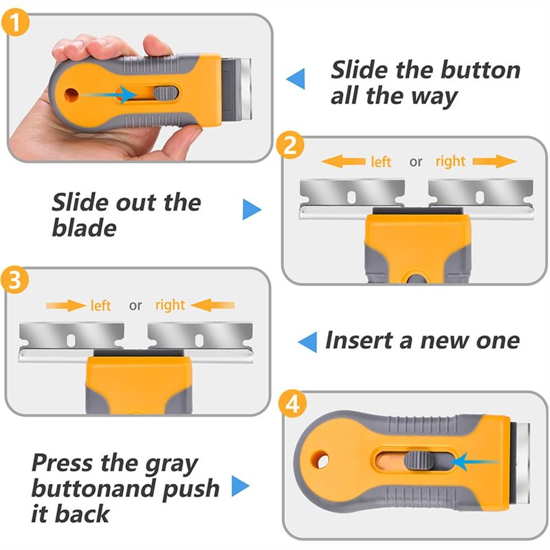 - Easy to use --- Our razor blade scraper tools adopt an ergonomic handle design. Comfortable to hold and lasting use. Rotate the knob on the back of razor blade scraper, disassemble it and replace with a new blade, then fasten the knob. Replace the retractable cleaning scraper blade, simply press the gray button switch in the middle and push it forward to the far end, then the blade will appear. To replace the old blade you can remove it from the left and right sides.