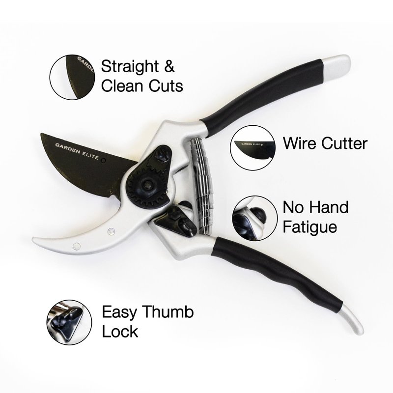 - Ergonomic Rubber Grip - This pair of premium garden cutting shears feature a forged aluminum handle that has been ergonomically designed to fit comfortably in your hand. The handle is coated with non-slip rubber grips for added comfort and an easy-to-operate thumb lock.