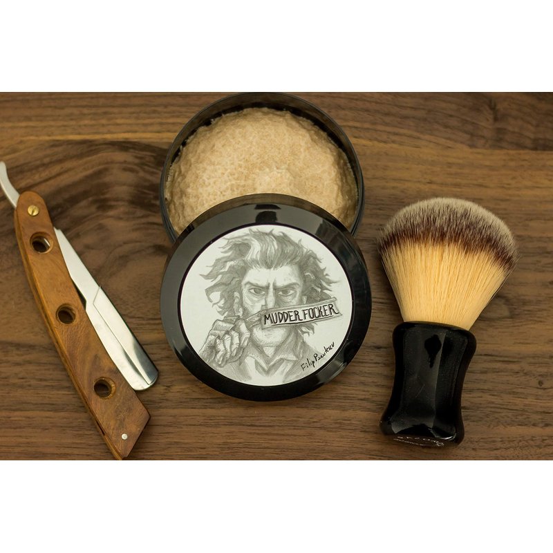 What else makes Mudder Focker special? Well, it's a tallow based soap. Tallow fat, in the hands of a skilled soap making artisan makes for a beautiful cushion-y lather that offers excellent protection from the razor blade. Mudder Focker is a soft Italian style soap that is intended to be used with a traditional shaving brush. Simply swirl a damp shaving brush on top of the soap for 30-40 seconds and the brush will be sufficiently loaded, then you can finish creating the lather is a shaving mug, bowl, or my preferred method, right on the face. This soap is a tad thirsty so add more water to the lather if needed. If the lather is lacking slickness, that probably means it's too dry. Make sure to let the soap fully dry after using it. This means leaving it uncovered for at least 24 hours. If you cover the soap while it's still wet you can ruin it. If you use the soap 3-4 times a week or more, there is no reason to replace the cover once you first open it.