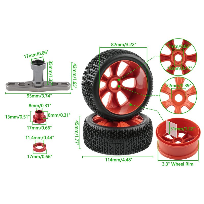 - Drive Hex Size: 17mm, Axle Diameter for the Adapter: 8mm, Wheel Hub Center Hole Dia: 12mm, Tire Width: 45mm(1.77''), Outer Diameter: 114mm(4.48''), Depth to the Hex Mount: 31mm