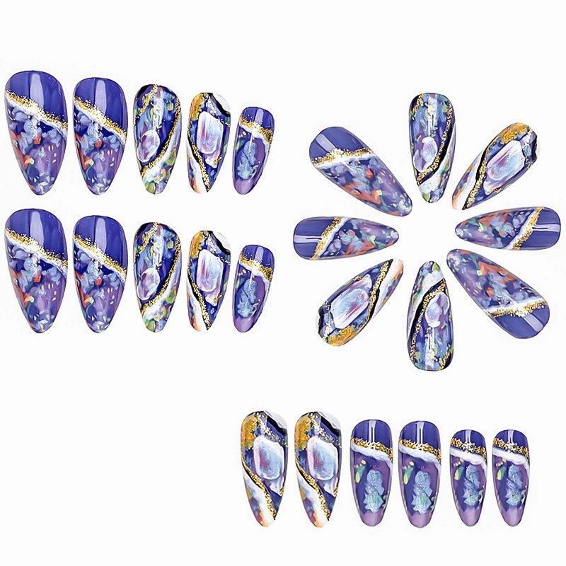 Rchosvam Press on Nails Medium Almond Fake Nails Purple Marble Stick on Nails Colorful Glaze Flase Nails with Design for Womens 24pcs