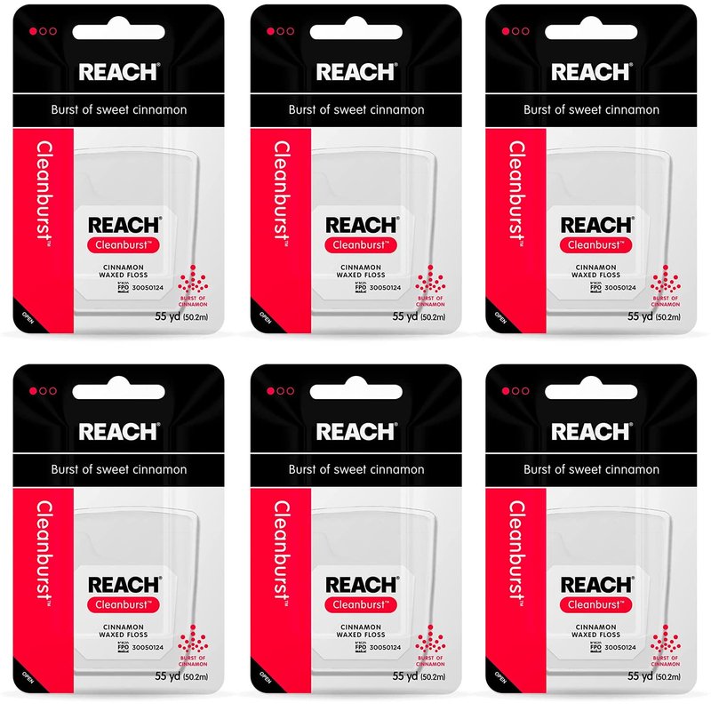 REACH Waxed Dental Floss 6 Pack Bundle, Cinnamon, Plaque Remover, Shred Resistant, Extra Wide Cleaning, Gentle on Gums & Teeth, PFAS-Free, Oral Care, for Adults & Kids, 55yd