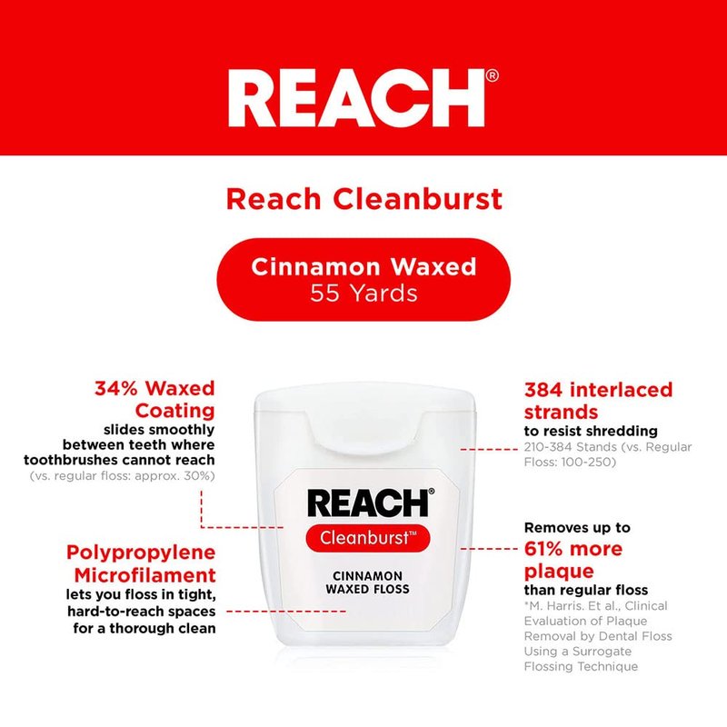- Effective Plaque Removal: 55 yards of Reach , a cinnamon flavored, waxed dental floss with an extra-wide cleaning surface specifically designed for wide spaced teeth