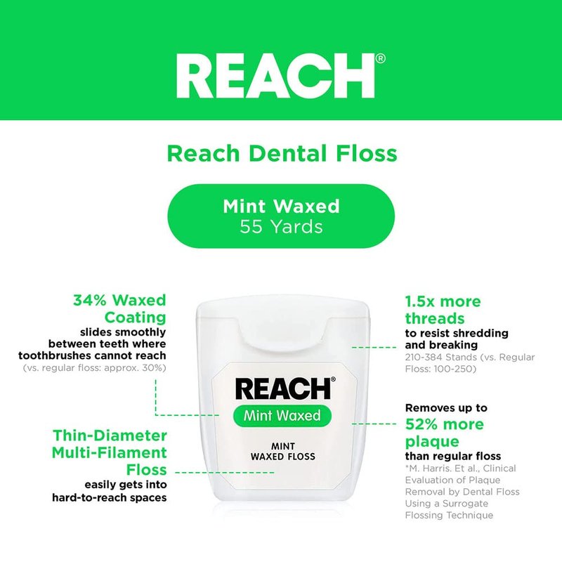 - Effective Plaque Removal: 55 yards of Reach , PFAS-Free, a mint flavored, waxed dental floss with an extra-wide cleaning surface specifically designed for wide spaced teeth